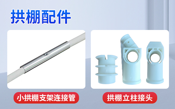 拱棚配件包含玻璃纤维链接管,卡扣,塑料扎带,接头盖子,各种连接件